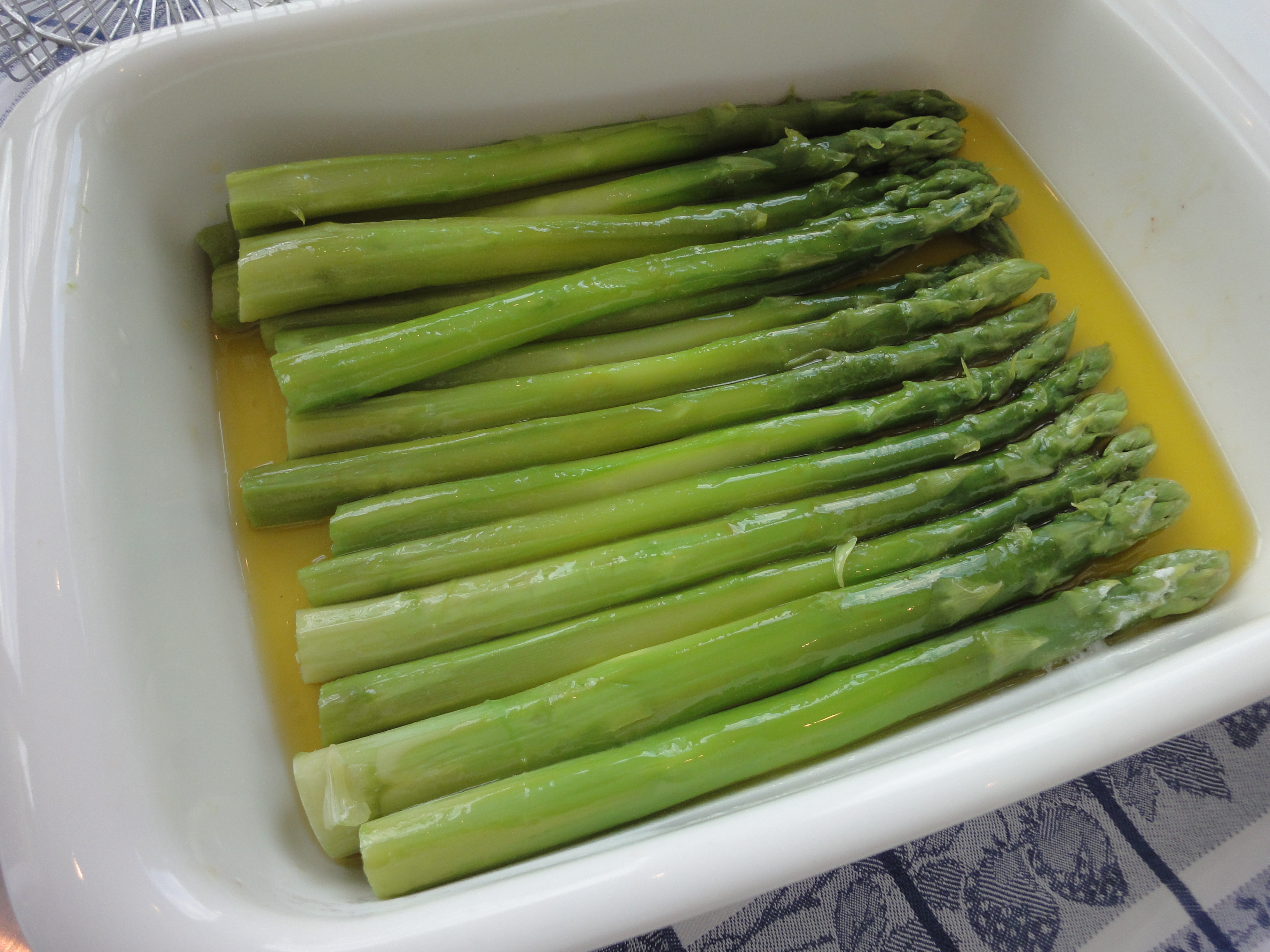 Essig mit etwas Salz, Zucker und 6 EL Olivenöl verschlagen, Dressing und Kapern über den Spargel geben, ca. 1/2 Stunde marinieren, dabei öfter wenden.