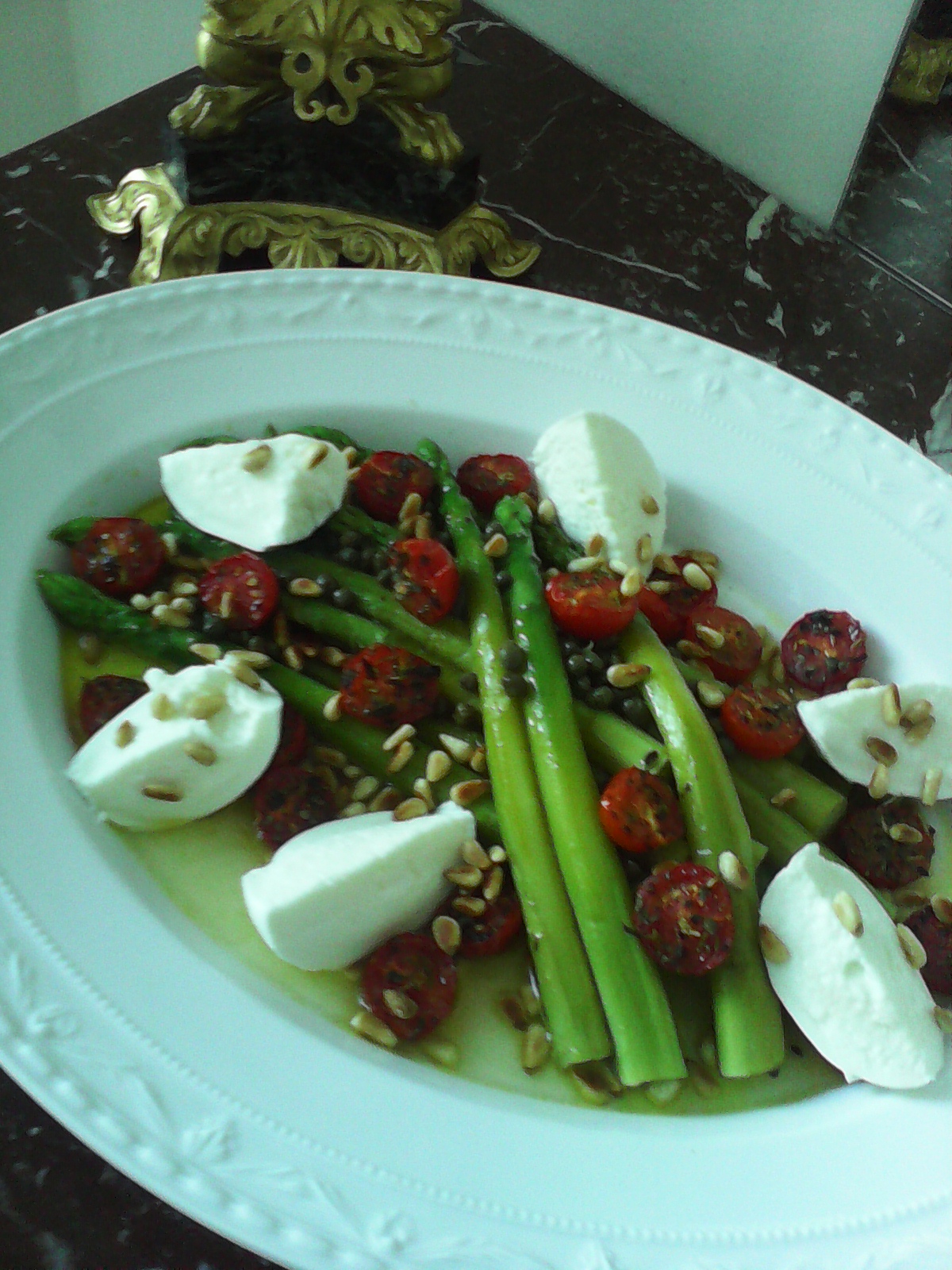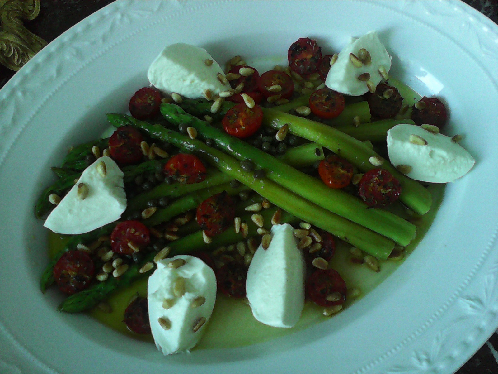 Spargelsalat mit getrockneten Tomaten und Mozzarella anrichten, die Pinienkerne darüber streuen. Grüner Spargelsalat mit dem restlichen Olivenöl beträufeln oder Öl nach Belieben separat dazureichen.