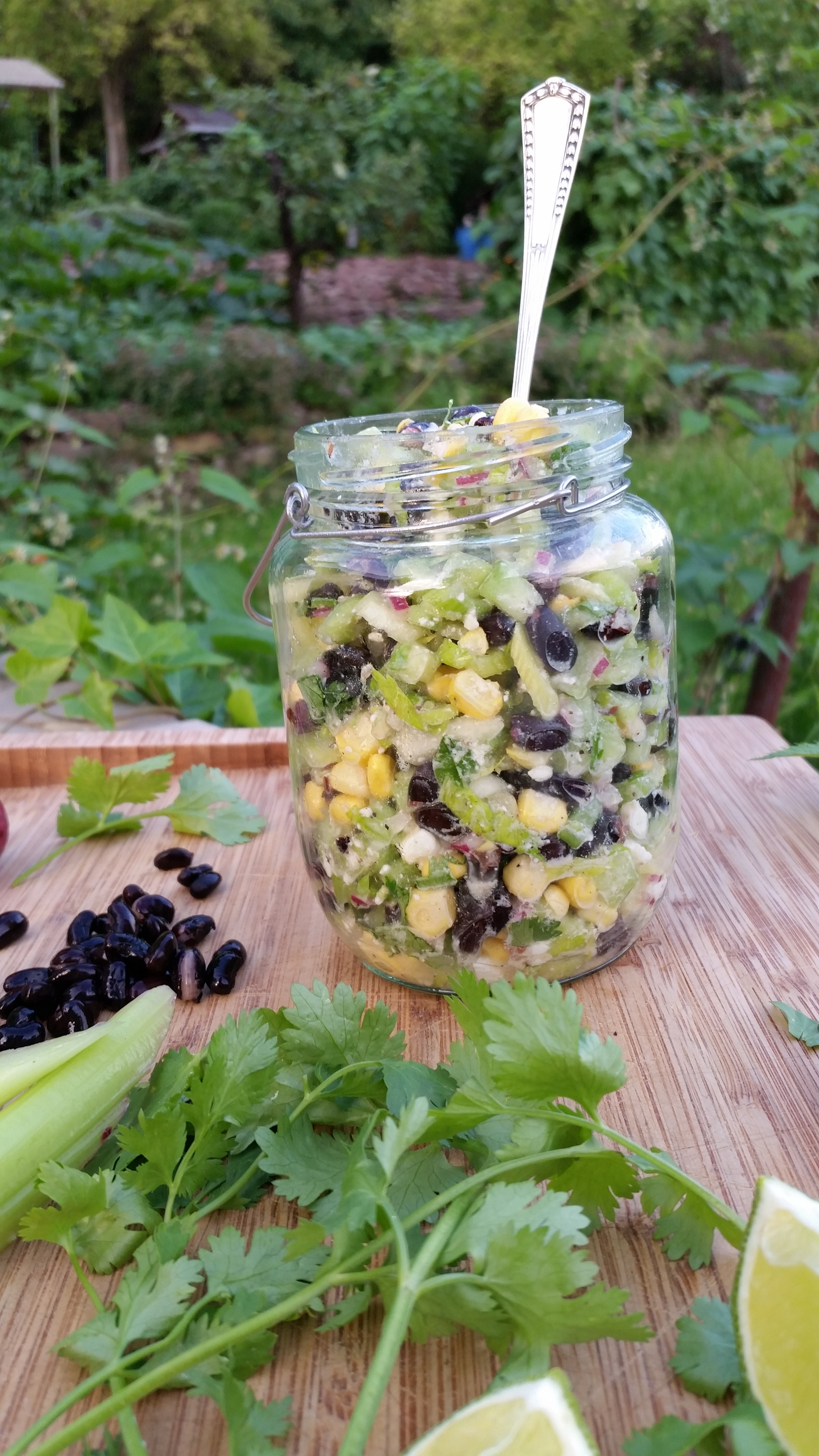 Die schwarze Bohnen in reichlich Salzwasser kochen so dass sie weich sind aber noch eine leichten Biss haben. Die Bohnen, Mais, Gurken, Koriander, Sellerie und Feta in einer großen Schüssel geben und gleichmäßig vermischt. Zitronensaft und Essig verrühren und hinzufügen mit Salz, Pfeffer und Kreuzkümmel abschmecken. Je nach Geschmack noch etwas Limettensaft hinzufügen.