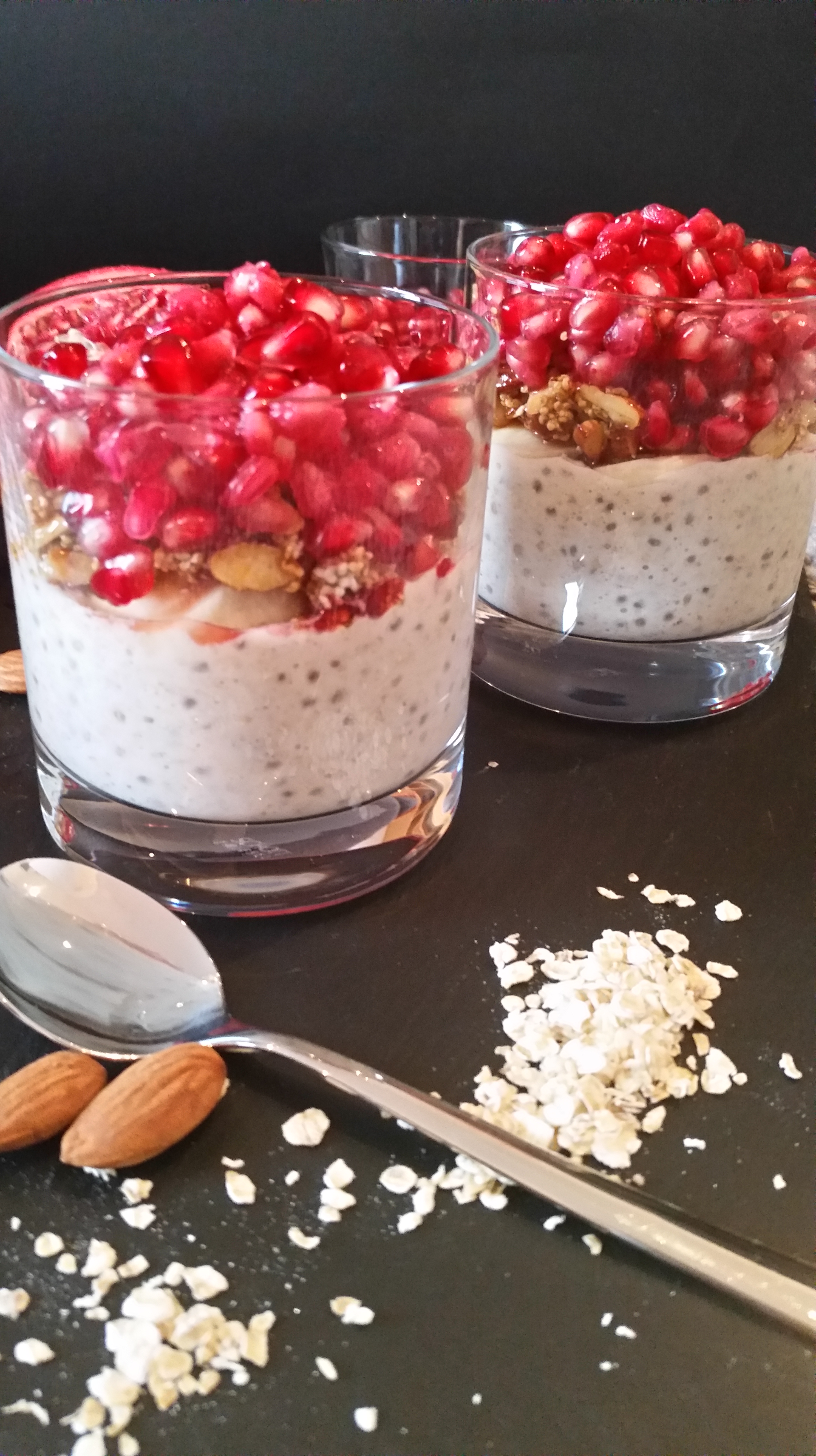 Granatapfel- Overnight-Oats mit karamellisierten Mandeln & Chia Shots