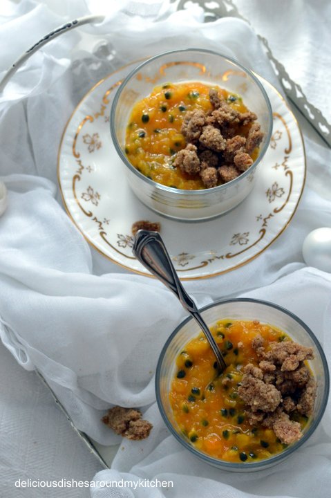 8. Vor dem Servieren die Birnenwürfel mit etwas Saft auf die Gläser aufteilen und mit der Karamellsauce und etwas Amarettini- Keksen toppen.