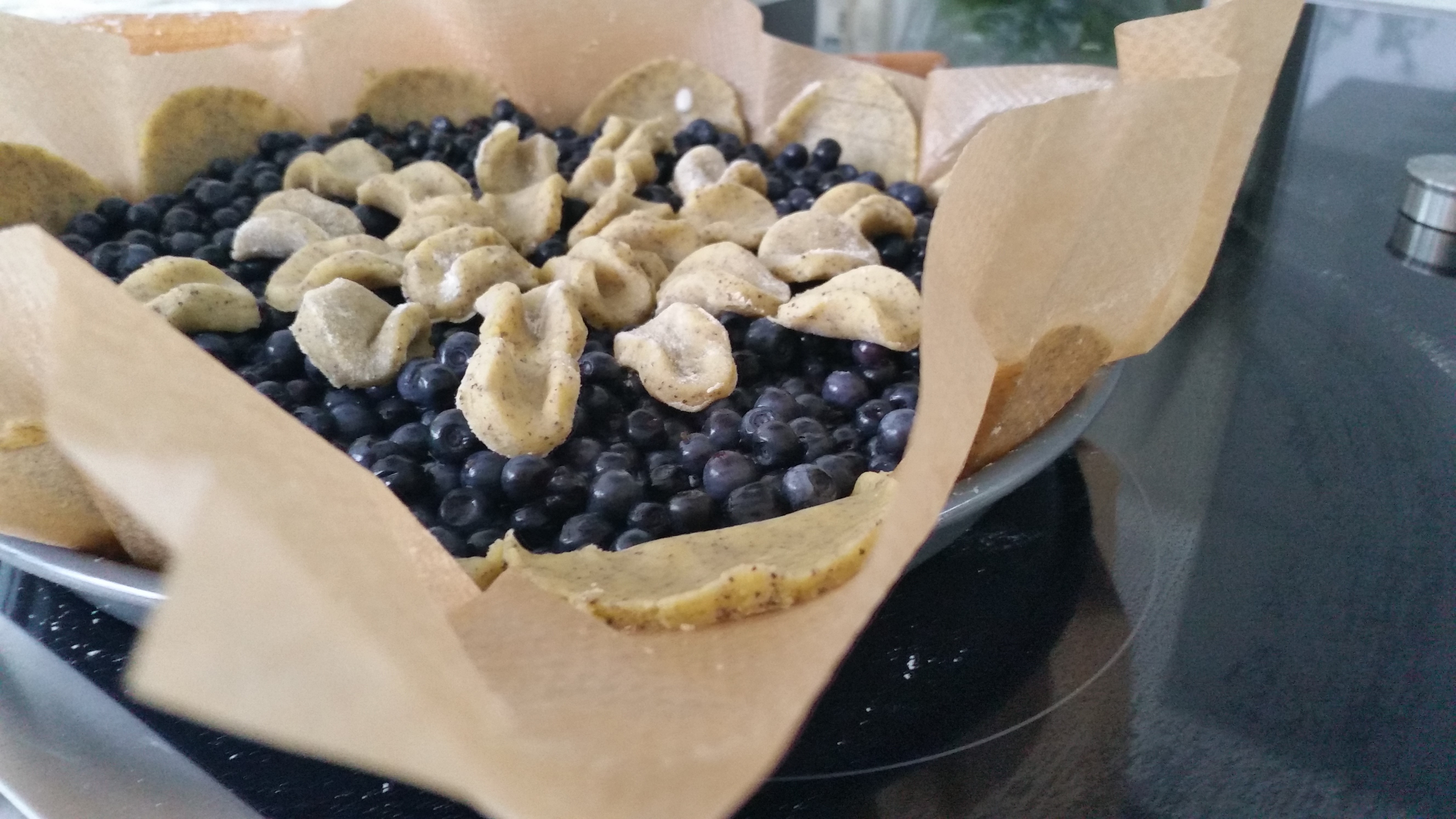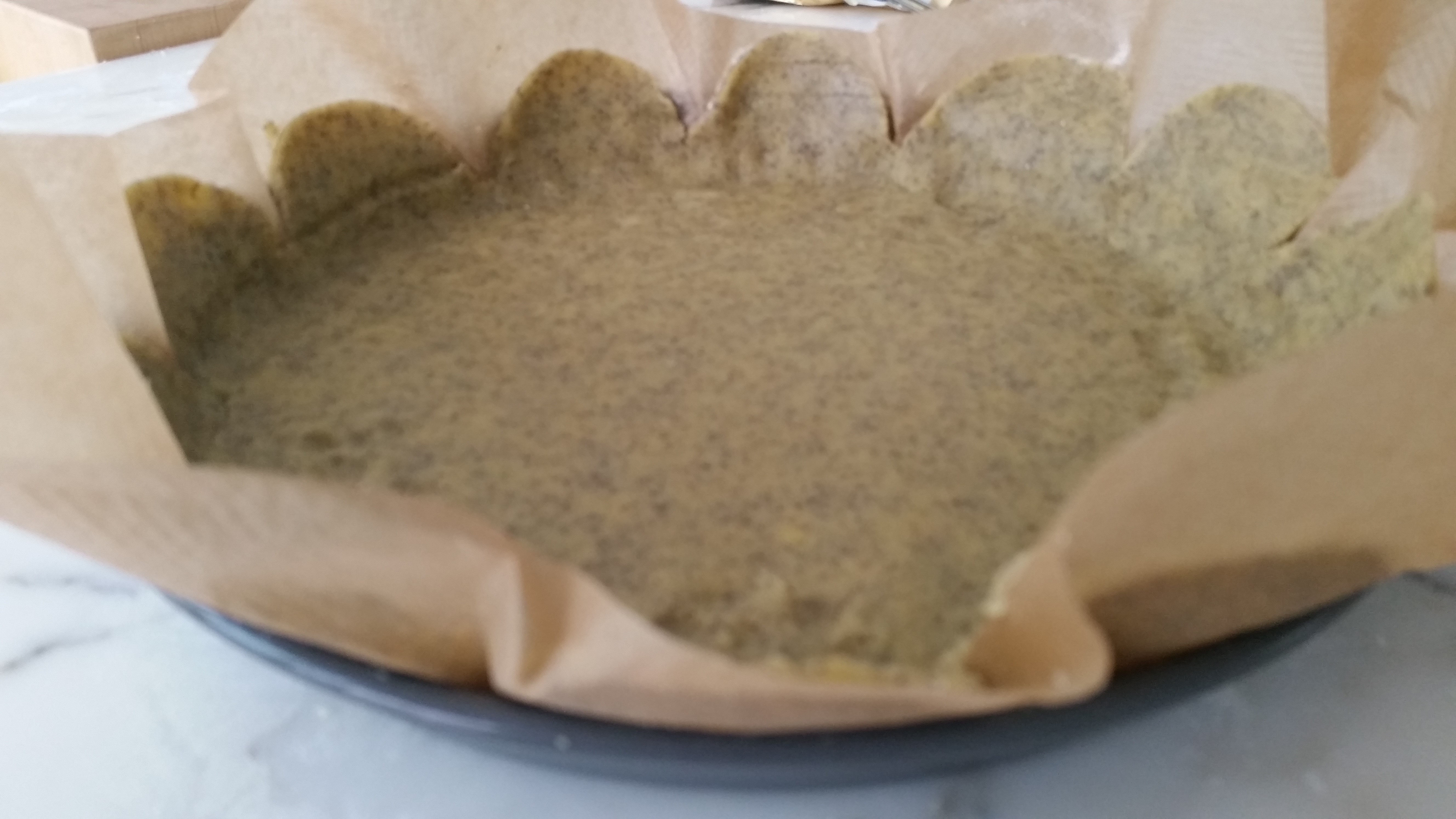Die Hälfte des Mürbeteigs auf bemehlter Arbeitsfläche zu einem Kreis (26 cm Ø) ausrollen. Springform (26 cm Ø) fetten. Boden mit der Teigplatte auslegen. Restlichen Teig ausrollen. Streifen von 5 cm Breite schneiden und an den Formrand drücken. Boden mit einer Gabel mehrmals einstechen.