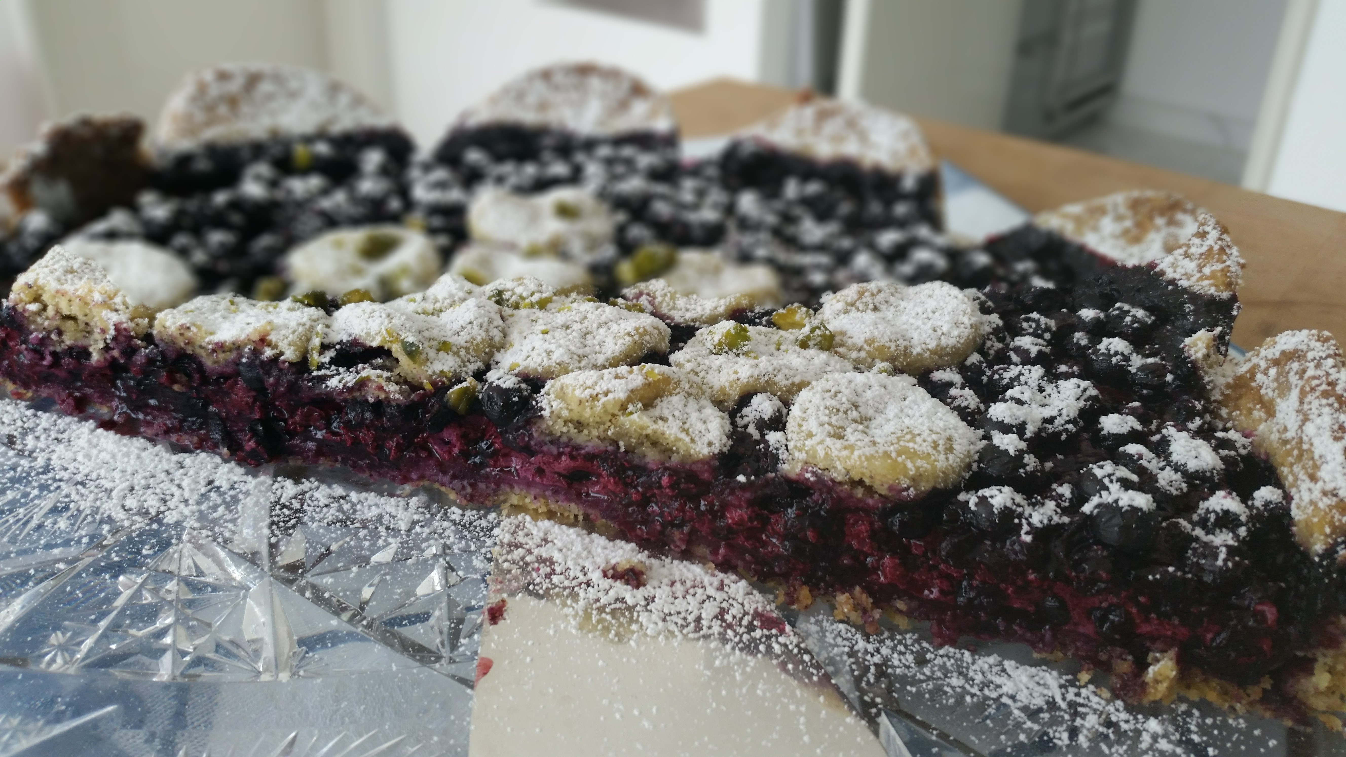 Pustekuchen…..;-( nachdem ich den Kuchen für eine Stunde alleine gelassen hatte, um noch ein paar Dinge zu erledigen, kam ich zurück in die Küche und traute meinen Augen nicht, der Kuchen war mittlerweile von dem Kuchengitter auf einen nicht wirklich passenden Kuchenteller gesetzt worden und war dabei mehrere Male am Rande gebrochen ;-( !!!!! Das Verlangen nach einem Stück Kuchen war anscheinend so groß gewesen dass keiner mehr warten wollte….;-) und somit war fast schon die Hälfte der Torte gegessen und oh weh…die noch nicht richtig erkalteten Pflaumen liefen leicht heraus! Das sollte natürlich nicht passieren…..aber egal geschmeckt hat er trotzdem so war auch jeden Fall die Resonanz der begeisterten Kuchengenießer 😉 und keiner empfand es als schlimm, dass die Pflaumenmasse noch nicht ihre endgültige Festigkeit hatte. Nichts destotrotz habe ich den Kuchen in meinem Perfektionismus sogleich mit dem Tortenheber auf eine passende Kuchenplatte gesetzt, in Form gebracht durch das umwickeln mit einer Frischhaltefolie, und ab ging es zum Auskühlen nochmal kurz in den Kühlschrank !