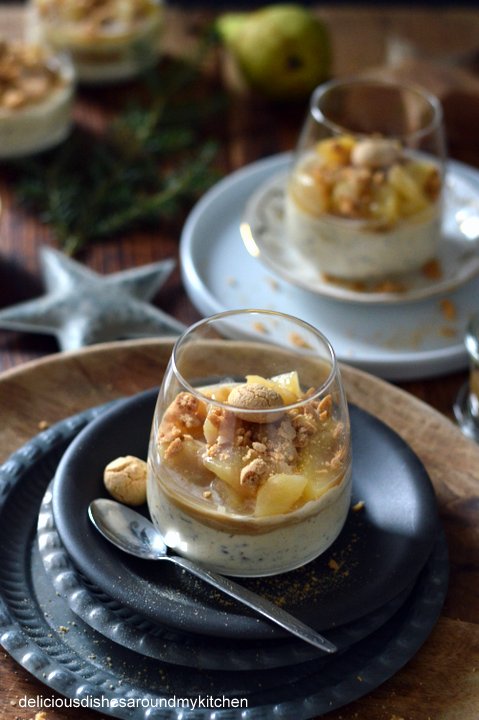 8. Vor dem Servieren die Birnenwürfel mit etwas Saft auf die Gläser aufteilen und mit der Karamellsauce und etwas Amarettini- Keksen toppen.