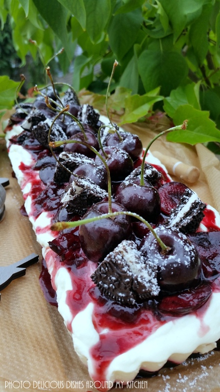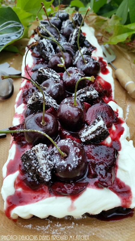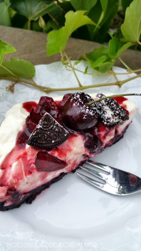 Zum Schluss die Oreo- Kirsch- Tarte mit Puderzucker bestäuben.