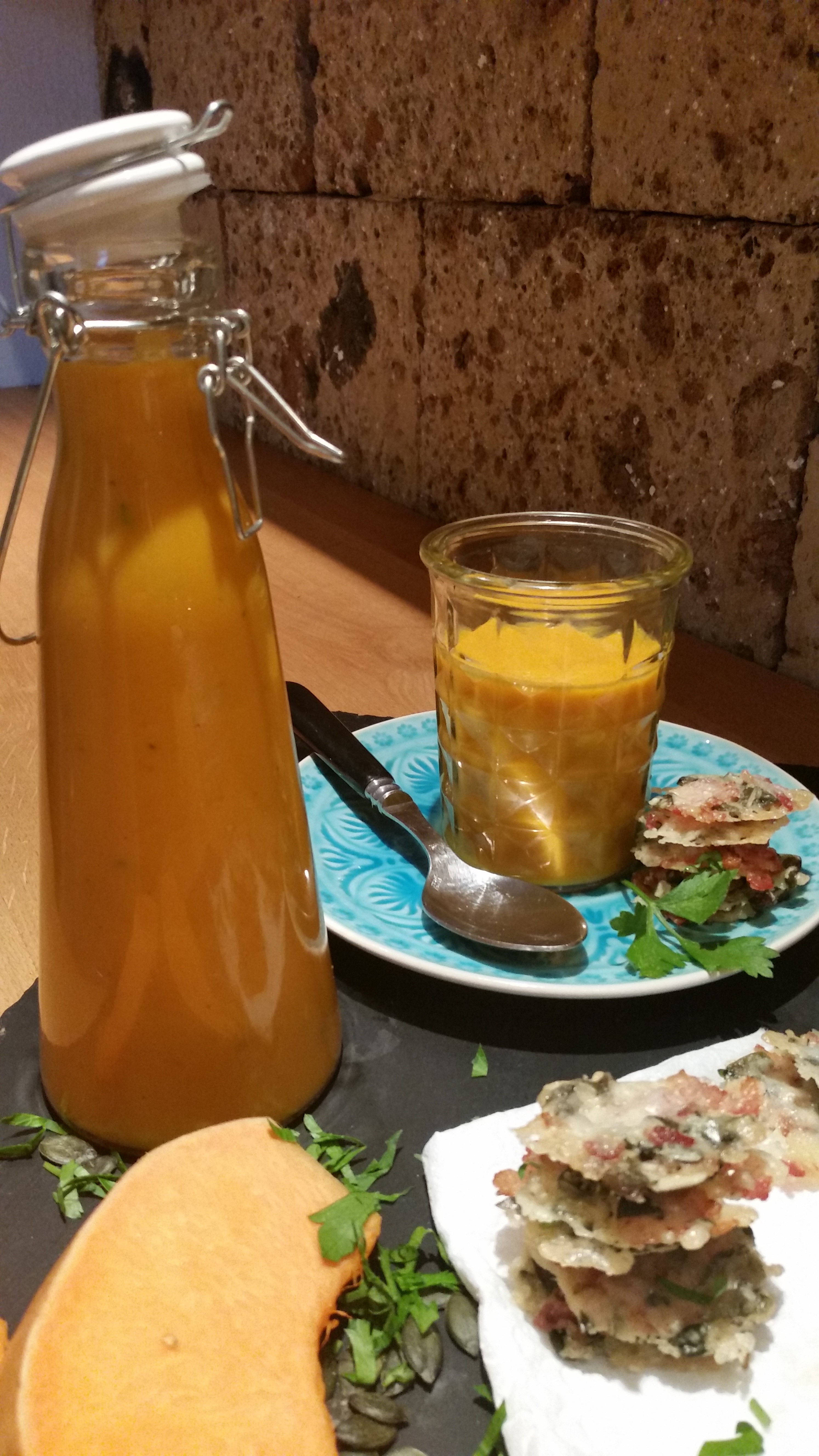 Die Kalbsscheiben nochmals falls nötig mit Salz, Pfeffer und Zucker abschmecken. Mit dem Kürbis- Püree anrichten, mit Petersilie dekorieren und servieren.