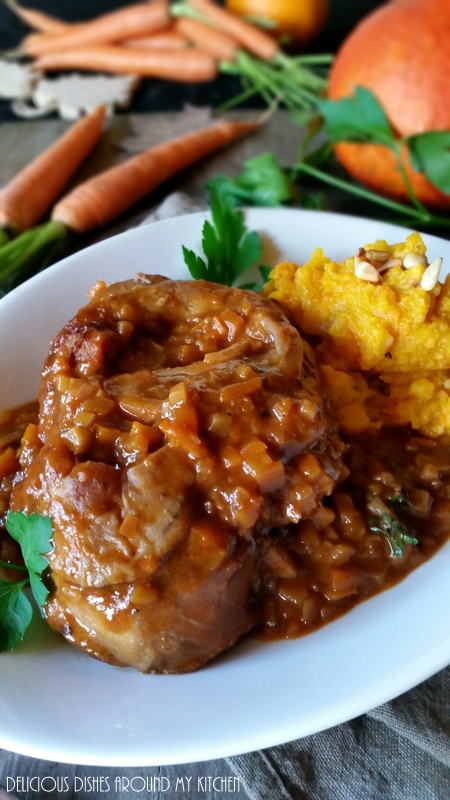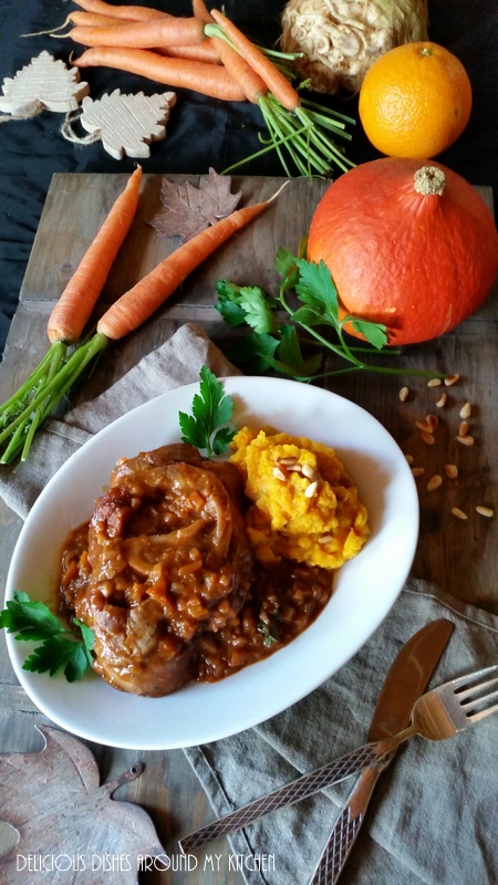 Den italienische Klassiker Ossobuco habe ich heute in Marsala, einem italienischen Dessertwein geschmort. Dazu gibt es ein Kürbis- Kartoffel- Püree, als Hauptgericht einfach nur gut! Ein wahrer Gaumenschmaus ist dabei für mich, die geniale Sauce mit dem vielen kleingeschnittenen Gemüse. Der Geschmack der Orange gibt der Sauce zusätzlich zu dem süßen Dessertwein die besondere Note. Das Kürbis- Kartoffelpüree mit etwas Sellerie, im bayrischen auch Stampf genannt als Beilage, ist schlicht und wird durch die gerösteten Pinienkerne raffiniert aufgepeppt. Zu dieser Jahreszeit, wenn es draußen nebelig und regnerisch ist solch ein Gericht für mich genau das Richtige!