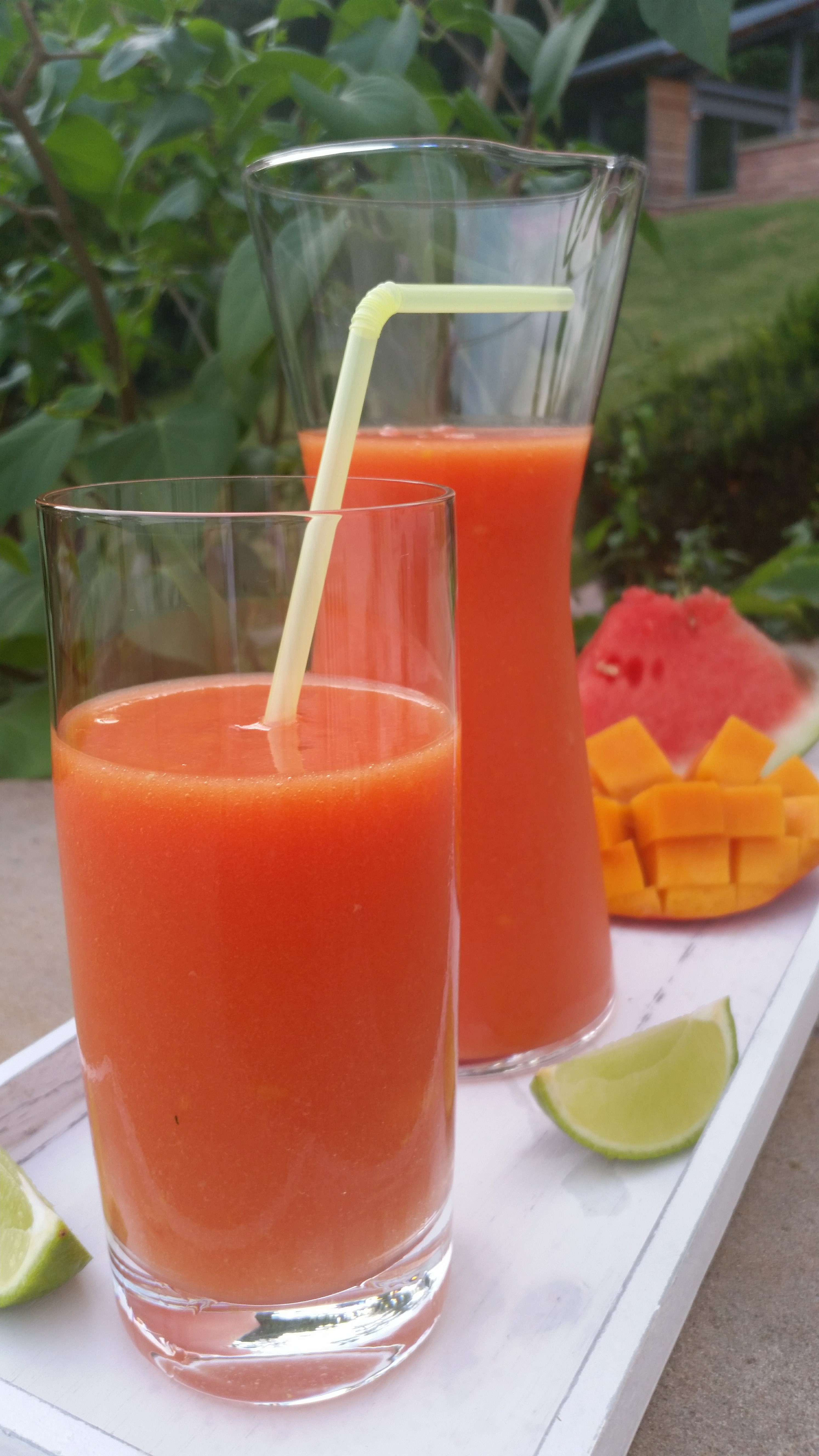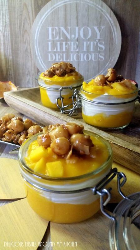 125g Zartbitter- Kuvertüre, Saft von 2 Orangen, 1 EL Rohrohrzucker, 50g Mango- Trockenfrüchte in Scheiben, 50g Haselnüsse gehackt, 50g Zartbitter- Schokolade gehobelt