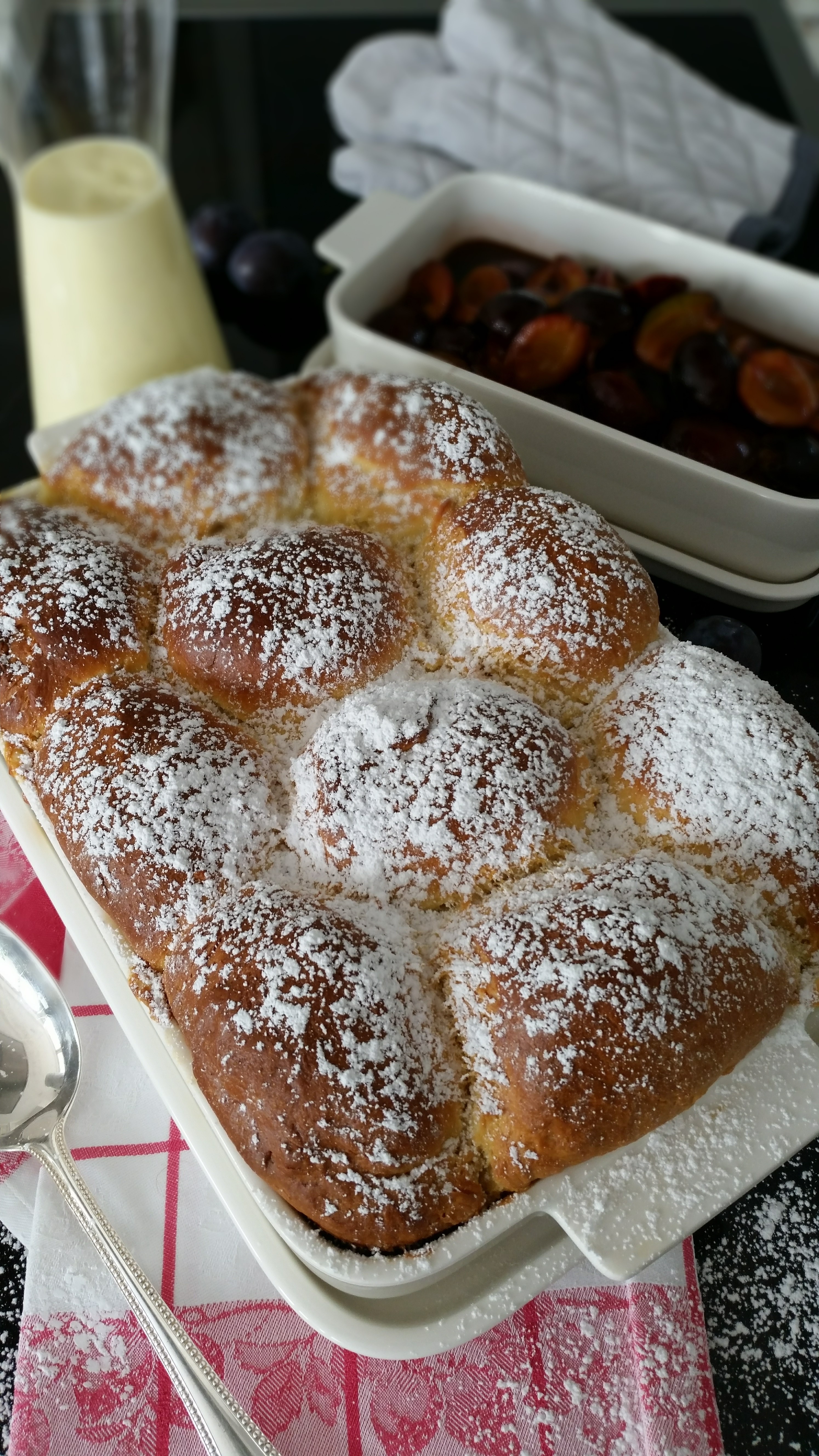 Den Teig auf einer bemehlten Arbeitsfläche zu einem großen Rechteck mit ca. 50×60 cm ausrollen. Die Zwetschgen mit der Hälfte der Zucker- Zimt- Mischung vermengen. Nun ca. 6 cm breite Teigstreifen zurechtschneiden, die Zwetschgen mittig der Länge nach auf die Teigstreifen legen. Den Teig mit den Fingern von beiden Seiten zu einer Rolle zusammendrücken. Die Rollen auf den mit Backpapier belegte rundes Boden der Backform setzen und dabei zu einer Schnecke rollen. Am Ende soll eine große Schnecke entstehen. Den Rand der Backform um den Teig legen und festmachen. Die restliche Zucker- Zimt- Mischung darauf verteilen. Den Kuchen im vorgeheizten Ofen 175C Ober- Und Unterhitze ca. 35 Min. backen.